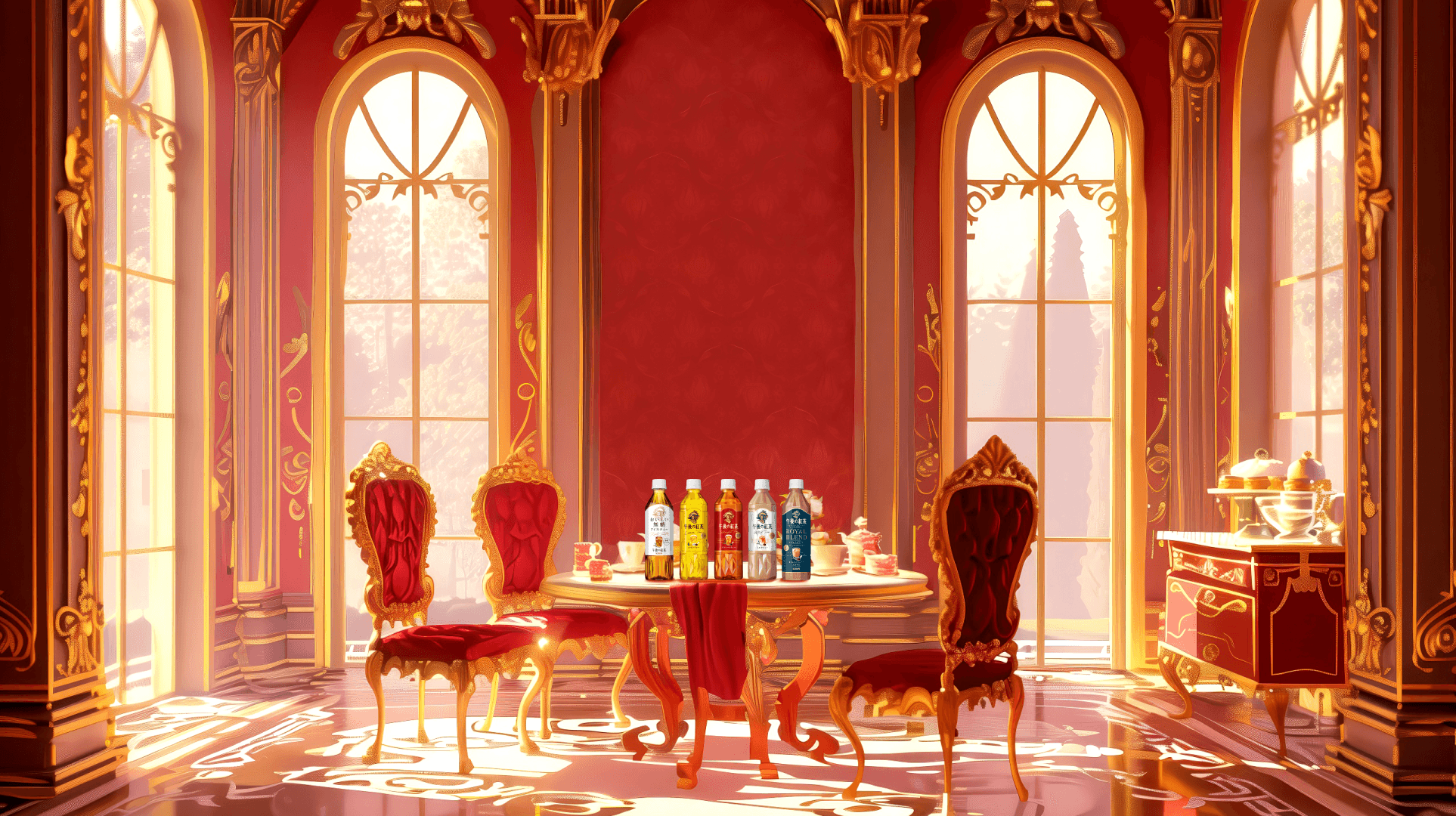 為了讓體驗者一秒帶入貴族感,我以 Midjourney 生成背景,配色採用品牌紅色系,加入金色點綴,提升奢華感,並細調茶桌上的擺飾配置,加強場景豐富度。